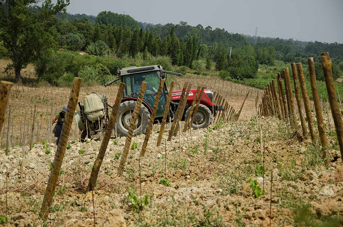 São 4 hectares de vinha, um deles com vinha muito mais velha do que os restantes. Na parte mais nova há uma inclinação muito grande, até um determinado ponto, onde se plantou a casta Baga e, na mesma linha, onde o terreno começa a ficar plano e menos argilo-calcário, plantámos videiras de uva branca.